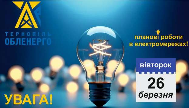У деяких населених пунктах Тернопільщини сьогодні, 26 березня, плануються роботи для поліпшення забезпечення електроенергією.
