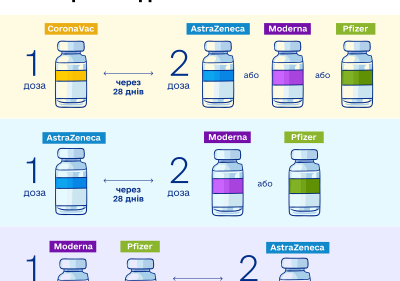 - Перша доза мРНК-вакцини (Pfizer, Moderna) + друга доза векторної вакцини (AstraZeneca)