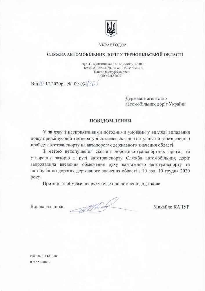 Служба автомобільних доріг в Тернопільській області прийняла рішення про обмеження з 10 години 10 грудня руху вантажних автомобілів та автобусів автошляхами Тернопільщини.