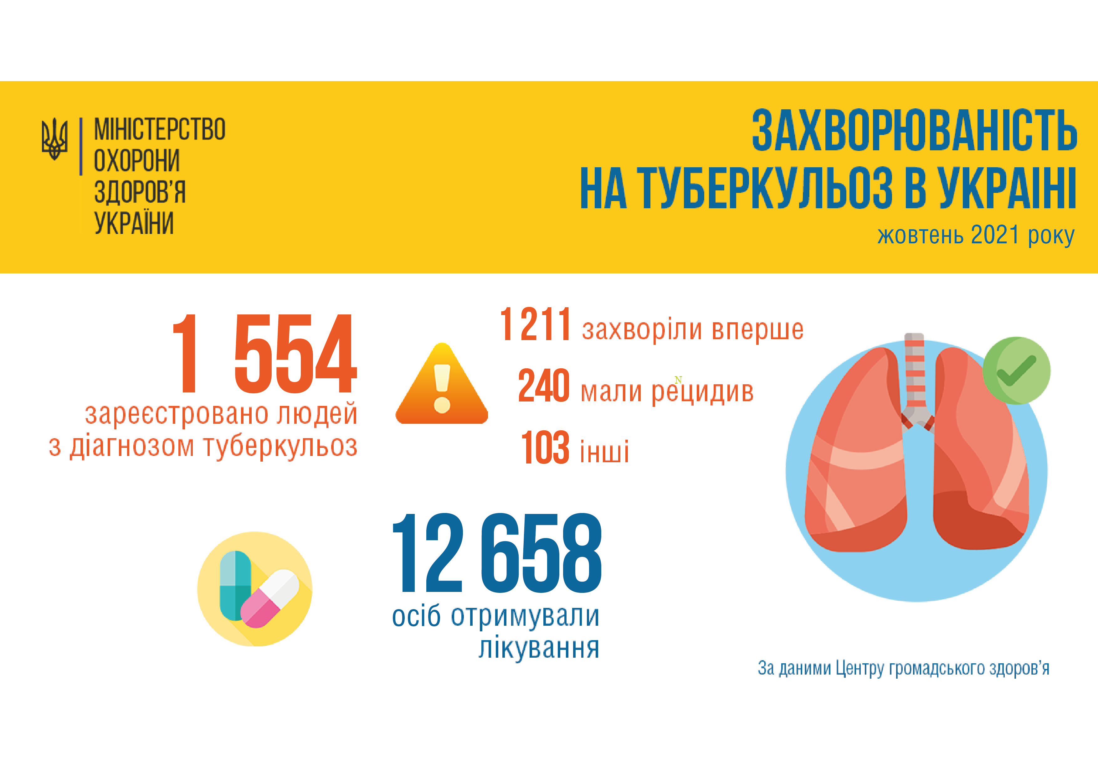 За даними Центру медичної статистики МОЗ України, упродовж 2020 року кількість людей, у яких вперше виявили туберкульоз (у тому числі з рецидивами), становила 17,5 тис. або 42,2 особи на 100 тис. населення. За жовтень 2021 року діагноз туберкульоз встановили 1 554 людям.