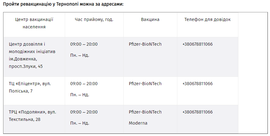 В Україні з 6 січня розпочалася вакцинальна кампанія бустерною дозою для всіх вакцинованих осіб віком від 18 років. Як повідомляють у міській раді,отримати додаткове щеплення у Тернополі можна у трьох центрах вакцинації населення.