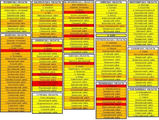 «Помаранчевий» рівень встановлено в містах Тернопіль, Бережани, Чортків та у Бережанському, Тернопільському районах Тернопільської області.  «Жовтий» рівень встановлено у Бучацькому, Гусятинському, Заліщицькому, Збаразькому, Козівському, Лановецькому, Підволочиському, Теребовлянському та Чортківському районах Тернопільської області. Новий розподіл на рівні почне діяти з понеділка 24 серпня.