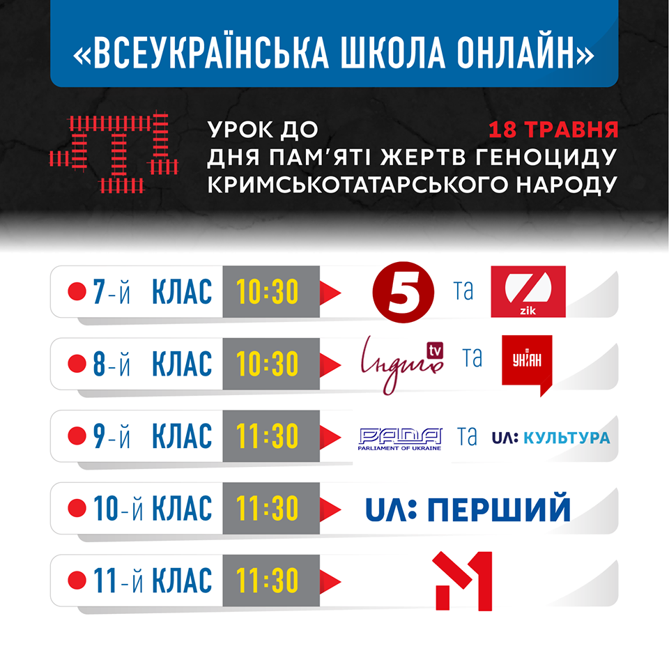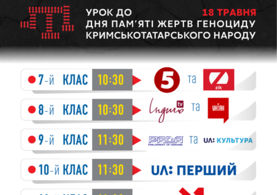 Тематичний урок, присвячений Дню пам’яті жертв геноциду кримських татар, 18 травня низка центральних телеканалів демонструватиме для учнів 7-11 класів. Початок — о 10:30 та 11:30 год., інформує Офіс Президента України.