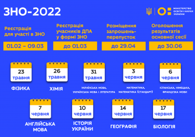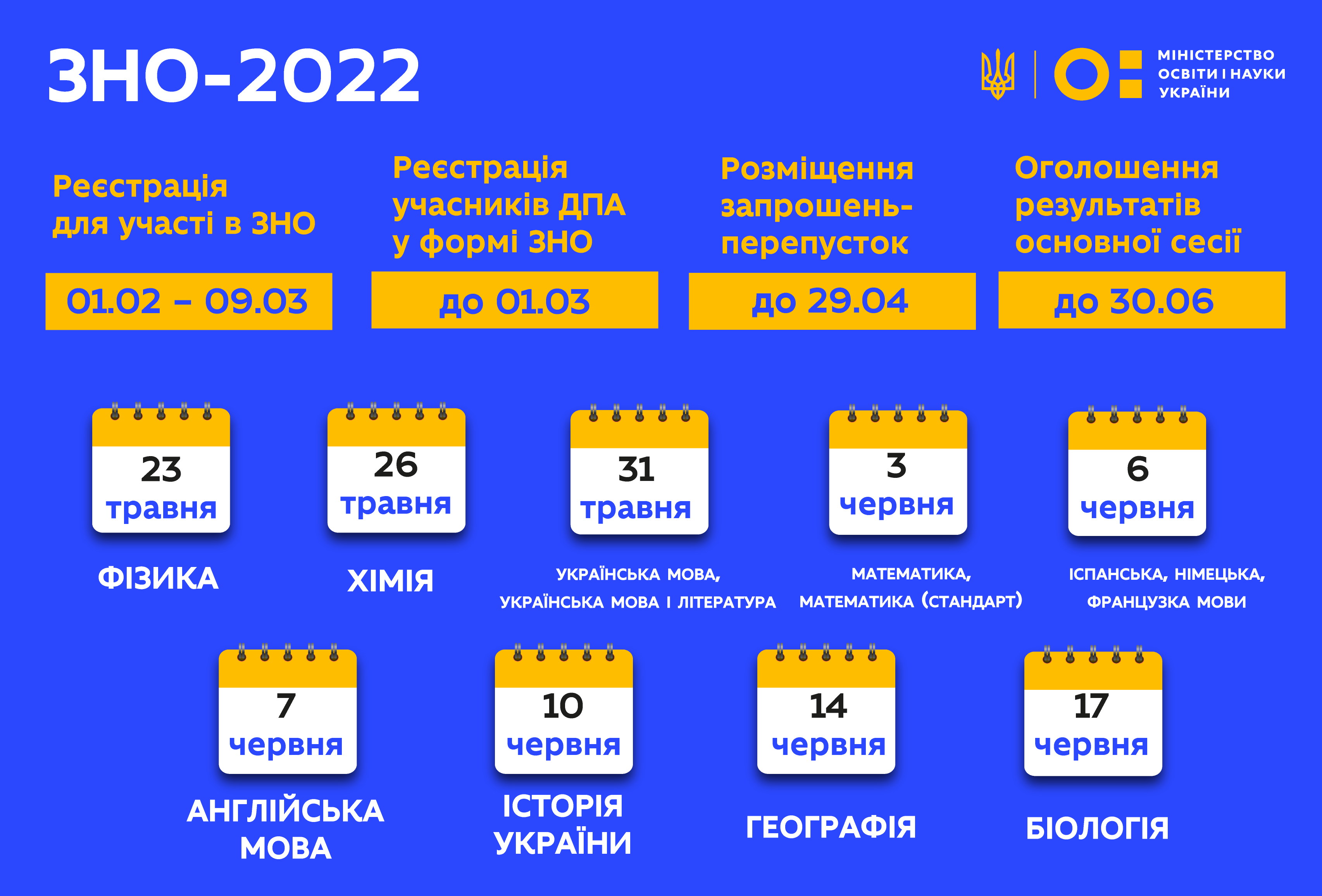 Основна сесія зовнішнього незалежного оцінювання 2022 року проходитиме з 23 травня до 17 червня. Інформацію про результати основної сесії ЗНО з усіх навчальних предметів буде розміщено до 30 червня на інформаційних сторінках учасників тестування.