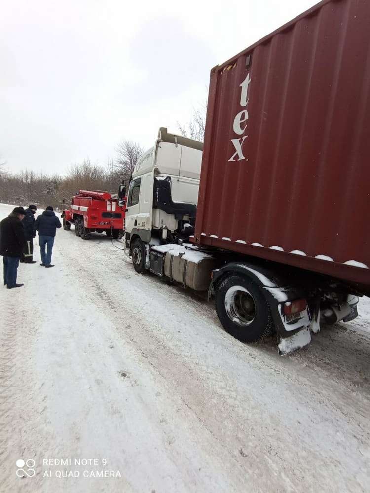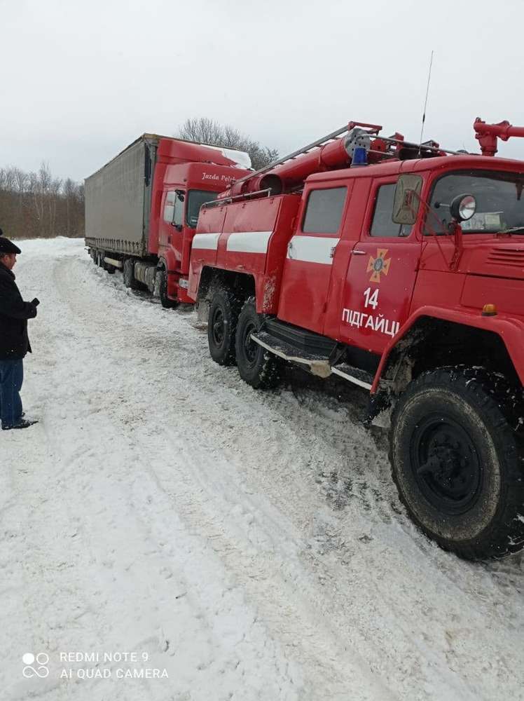 Спецтехніка управління ДСНС у Тернопільській області відбуксирувала фури на прочищену ділянку дороги.