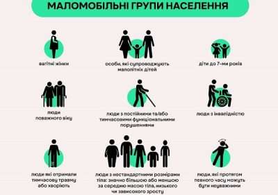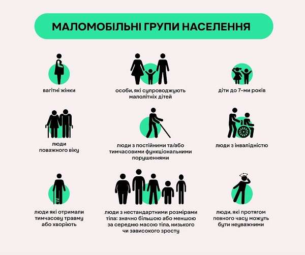 Це можуть бути люди літнього віку, особи з тимчасовими погіршеннями здоров’я (через травму чи хворобу), вагітні жінки, діти до 7 років, люди з нестандартними розмірами тіла та інші.
