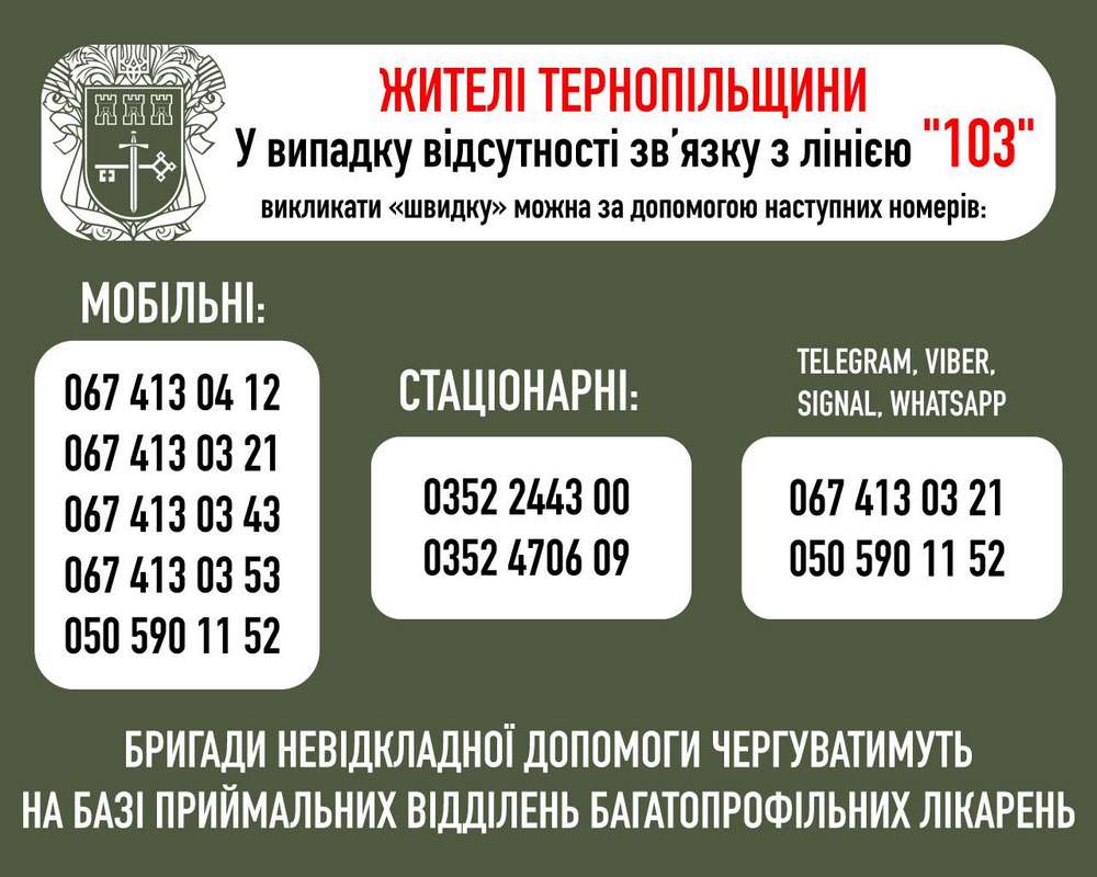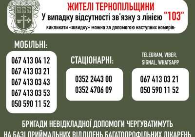 Жителі Тернопільщини, якщо з якихось причин не працює лінія “103”, ви можете зв‘язатися зі “швидкою” за номерами “101” та “112”. Рятувальники оперативно повідомлять медиків по рації. Про це повідомив начальник Тернопільської ОВА Володимир Труш.