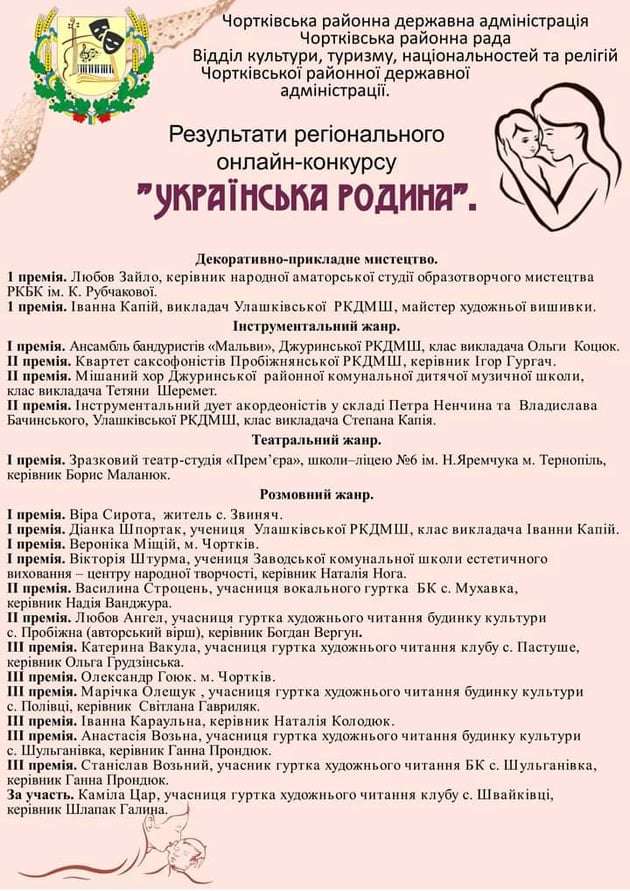 Медик з Чортківського району, яка сьогодні вивчає ще й журналістику Віра Сирота-Яблонь отримала першу премію у регіональному онлайн конкурсі “Українська родина”.