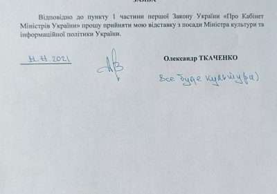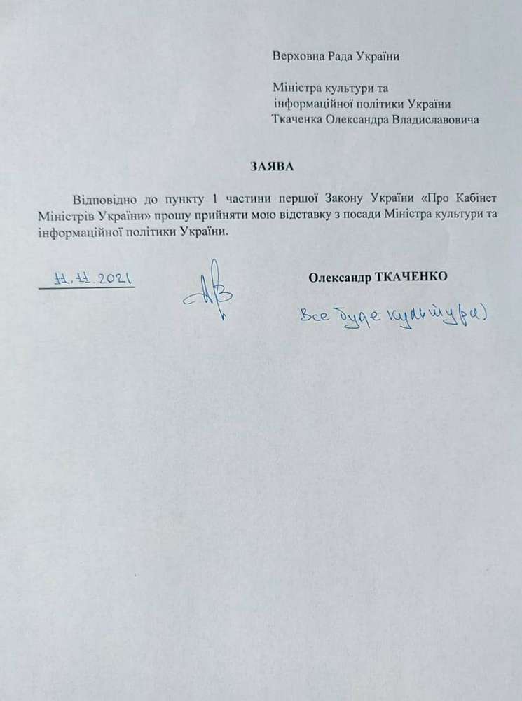 Міністр культури та інформаційної політики Олександр Ткаченко написав заяву про відставку. Причинами такого рішення називає рішення уряду забрати у Мінкульту Держкіно та бюджет на культуру на 2022 рік. Про це він повідомив у Facebook.