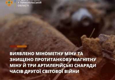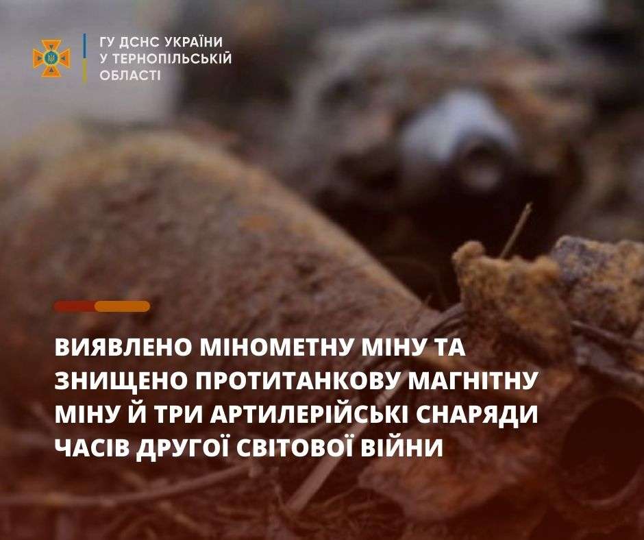 Цього ж дня фахівцями групи піротехнічних робіт аварійно-рятувального загону спеціального призначення Головного управління ДСНС вилучено та знищено в безпечному місці протитанкову магнітну міну ТМІ-43 мм, три артилерійські снаряди, калібром 88, 50 та 37 мм, часів Другої світової війни, виявлені напередодні у полі поблизу с. Доброполе Бучацької територіальної громади та на території лісового масиву поблизу с. Рідколісся Монастириської територіальної громади Чортківського району.