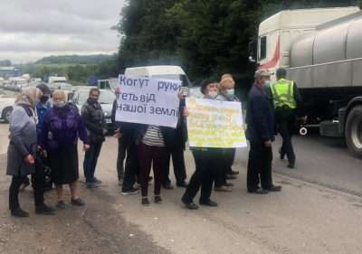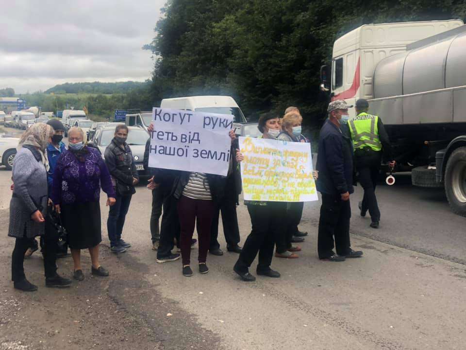 Пікетувальники заявляють, що місцевий фермер Роман Когут незаконно захопив їхні паї. У людей в руках плакати з надписами: «Когут, руки геть від нашої землі».