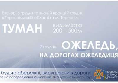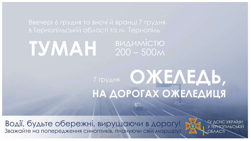 «ШТОРМОВЕ ПОПЕРЕДЖЕННЯ: Вночі і вранці 7 грудня очікується туман видимістю 200 – 500 м. 7 грудня ожеледь, на дорогах ожеледиця», – йдеться в добовому зведенні обласного управління ДСНС.