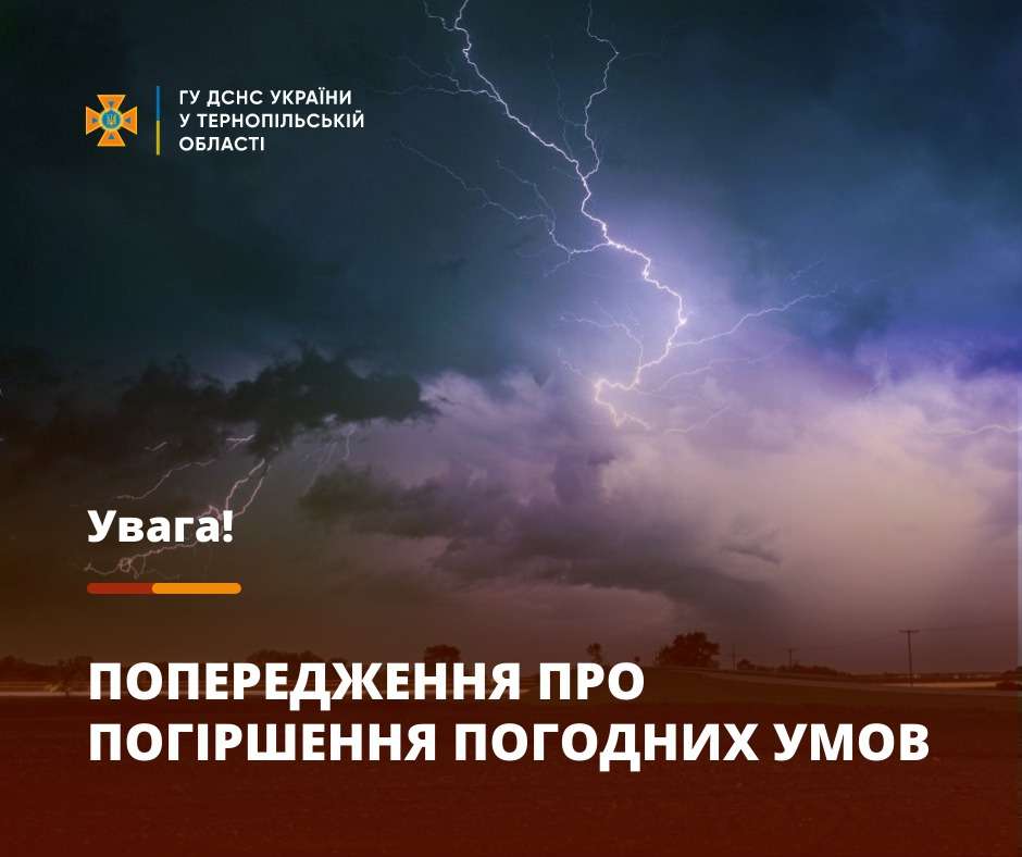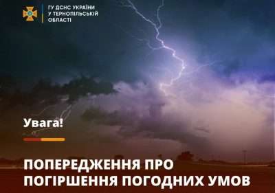 За інформацією Тернопільського обласного центру з гідрометеорології, в Тернопільській області та м. Тернопіль, в найближчі пів години, зі збереженням до кінця доби 8 квітня очікуються грози, подекуди град.