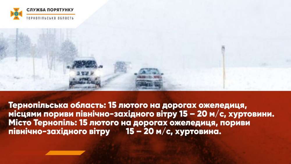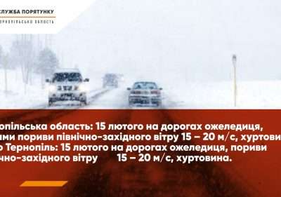 Штормове попередження: 15 лютого в Тернопільській області та місті Тернопіль – на дорогах ожеледиця, пориви північно-західного вітру 15-20 м/с, хуртовини.