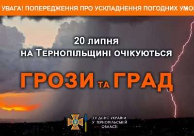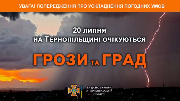 «За інформацією Тернопільського обласного центру з гідрометеорології, 20 липня в Тернополі та області очікуються грози, вдень подекуди град», – йдеться в повідомленні обласного управління ДСНС.