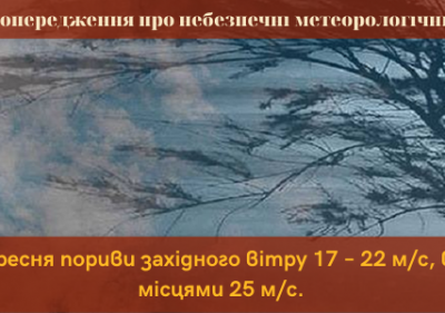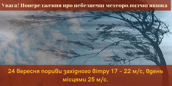 «Штормове попередження: 24 вересня пориви західного вітру 17 – 22 м/с, вдень – місцями 25 м/с», – йдеться в повідомленні на сайті обласного управління ДСНС.