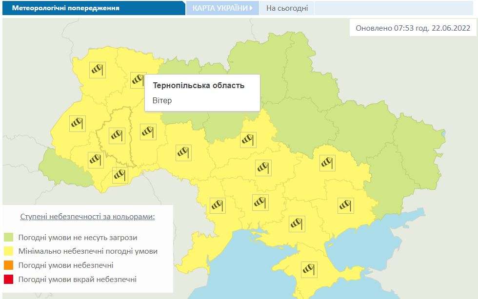 22 червня у західних, південних та більшості центральних регіонів очікується рвучкий вітер з поривами від 15 до 20 метрів на секунду. На Тернопільщині оголосили жовтий рівень небезпеки.