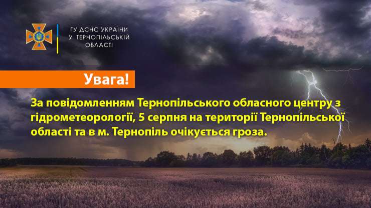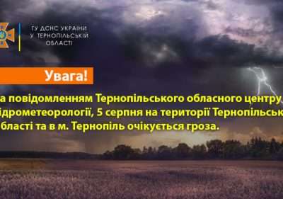 За повідомленням Тернопільського обласного центру з гідрометеорології, 5 серпня на території Тернопільської області та в м. Тернопіль очікується гроза.