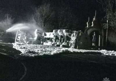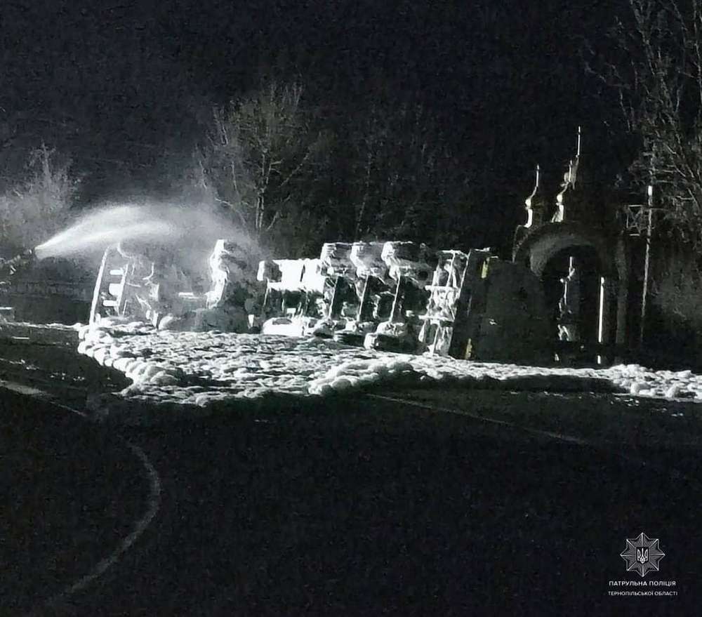 «Перекинувся тягач з напівпричепом, який призначений для перевезення паливно-мастильних матеріалів, а саме бензину, перекривши смуги для руху», – повідомили у патрульній поліції Тернопільщини.