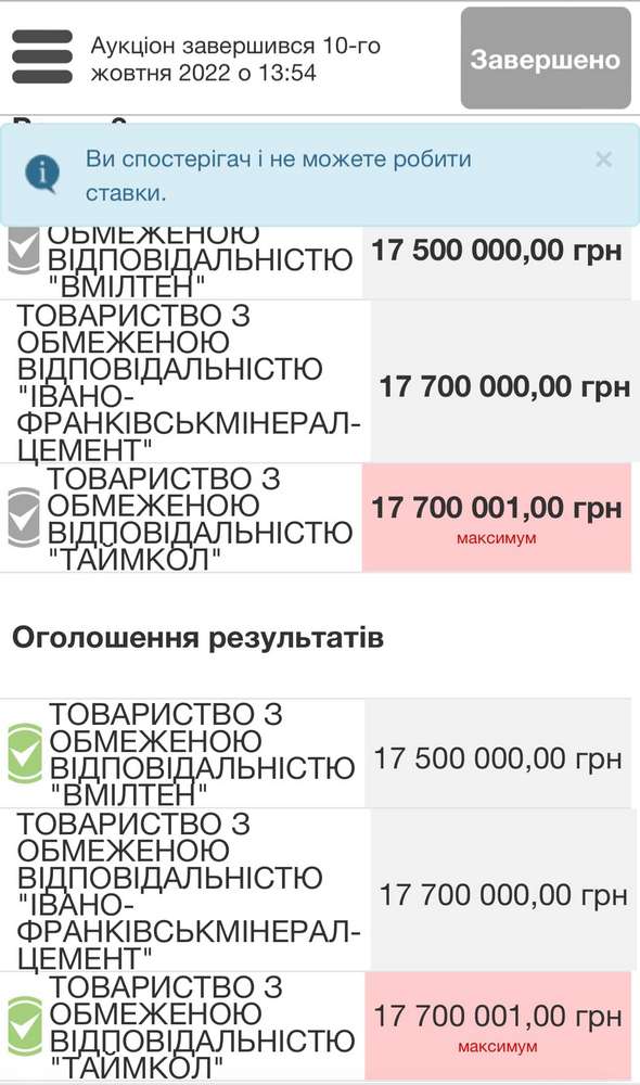 “При стартовій ціні 13 778 556.14 грн. за об’єкт змагались три учасники. Переможцем стало ТОВ «Таймкол», яке запропонувало найкращу ціну 17 700 001,00 грн. Чекаємо переможця для укладання договору та наближаємо Перемогу разом!”, – йдеться у дописі Яни Матієвої.