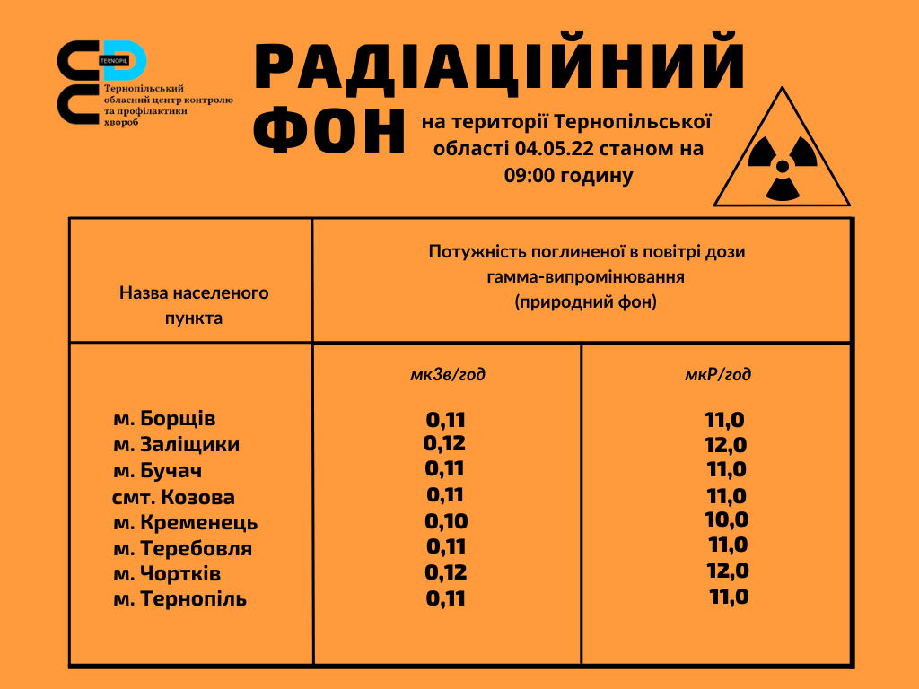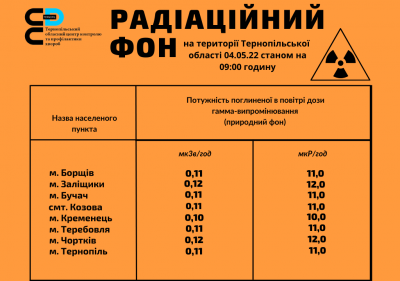 ДУ “Тернопільський обласний центр контролю та профілактики хвороб МОЗ України” оприлюднив дані щодо рівня радіаційного фону на території Тернопільської області.