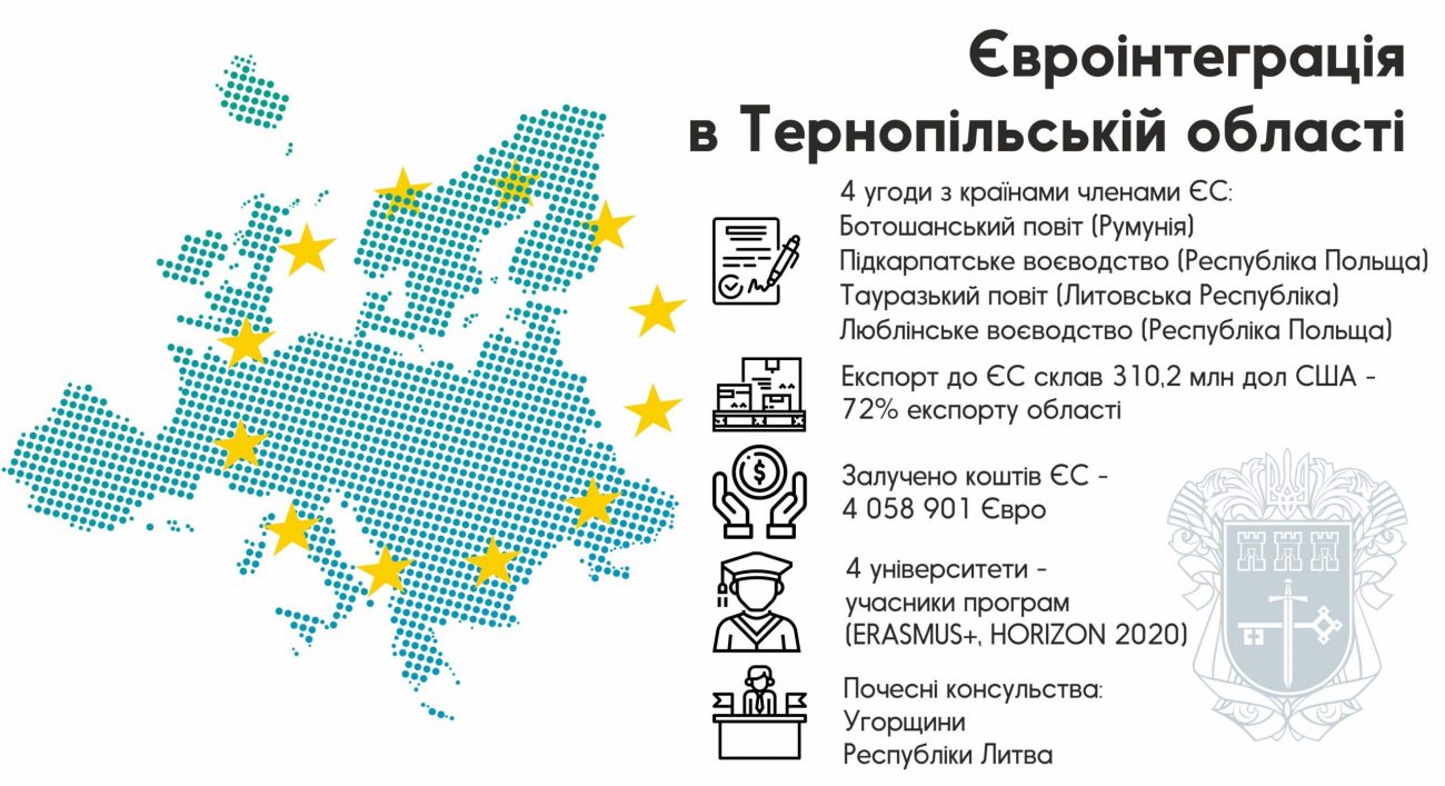Для Тернопільщини європейська інтеграція – це шлях модернізації економіки, залучення іноземних інвестицій і новітніх технологій, створення нових робочих місць, підвищення конкурентоспроможності товаровиробників та вихід на нові світові ринки. Також наша область налагодила тісні партнерські зв’язки з європейськими країнами, серед яких Польща, Італія, Німеччина, Румунія та Нідерланди.