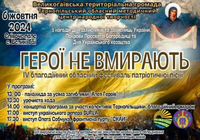 З нагоди Дня захисників та захисниць України, Покрови Пресвятої Богородиці та Дня Українського козацтва у неділю, 6 жовтня на 13:00 Великогаївська територіальна громада запрошує на IV благодійний обласний фестиваль патріотичної пісні «Герої не вмирають».