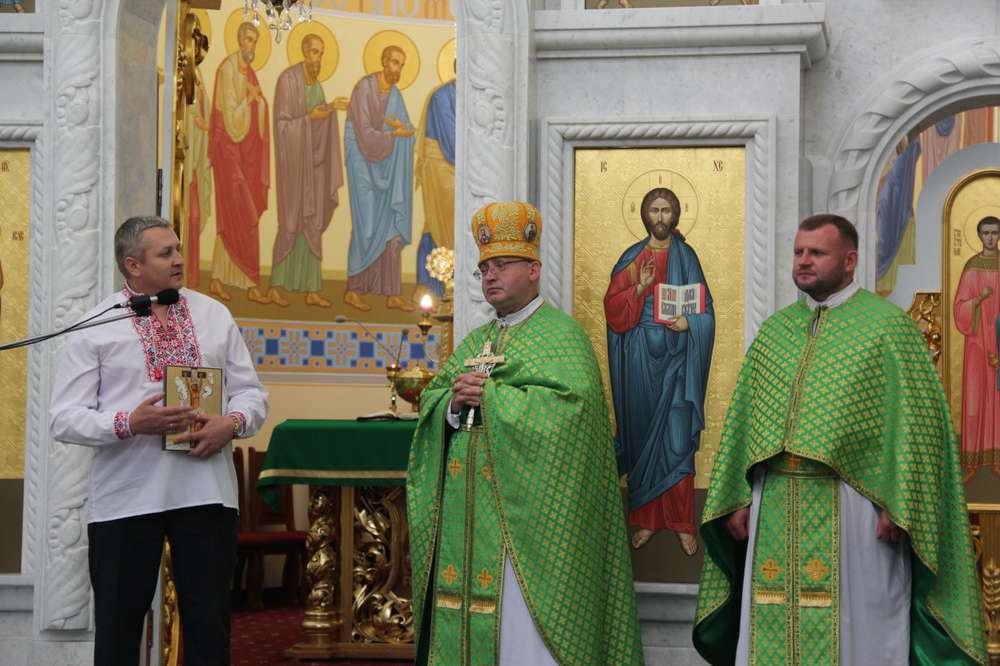 Після молитви о. Дмитро привітав усіх паломників, які прибули до відпустового центру та подарував їм ікони Розп’ятого Спасителя.