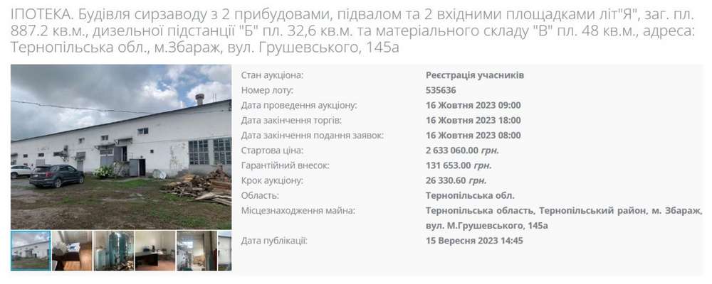 Стартова ціна лота становить 2,63 млн грн. Аукціон відбудеться 16 жовтня о 9:00.