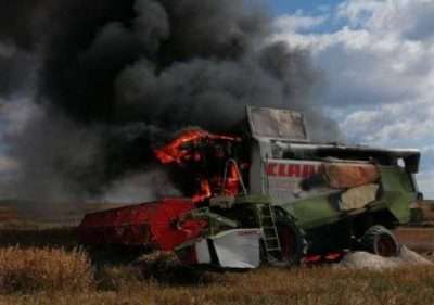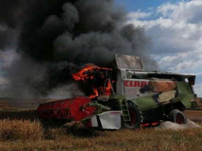Вогнем знищено привід шнека, відсік двигуна та кабіну, пошкоджено облицювання комбайна, шини та інше обладнання.