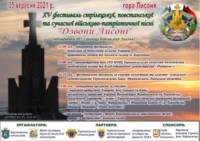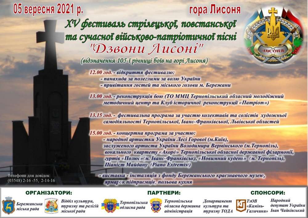 5 вересня 2021 року на горі Лисоня, що в місті Бережани Тернопільської області, вібудеться Всеукраїнський фестиваль стрілецької, повстанської та сучасної військово-патріотичної пісні “Дзвони Лисоні”.