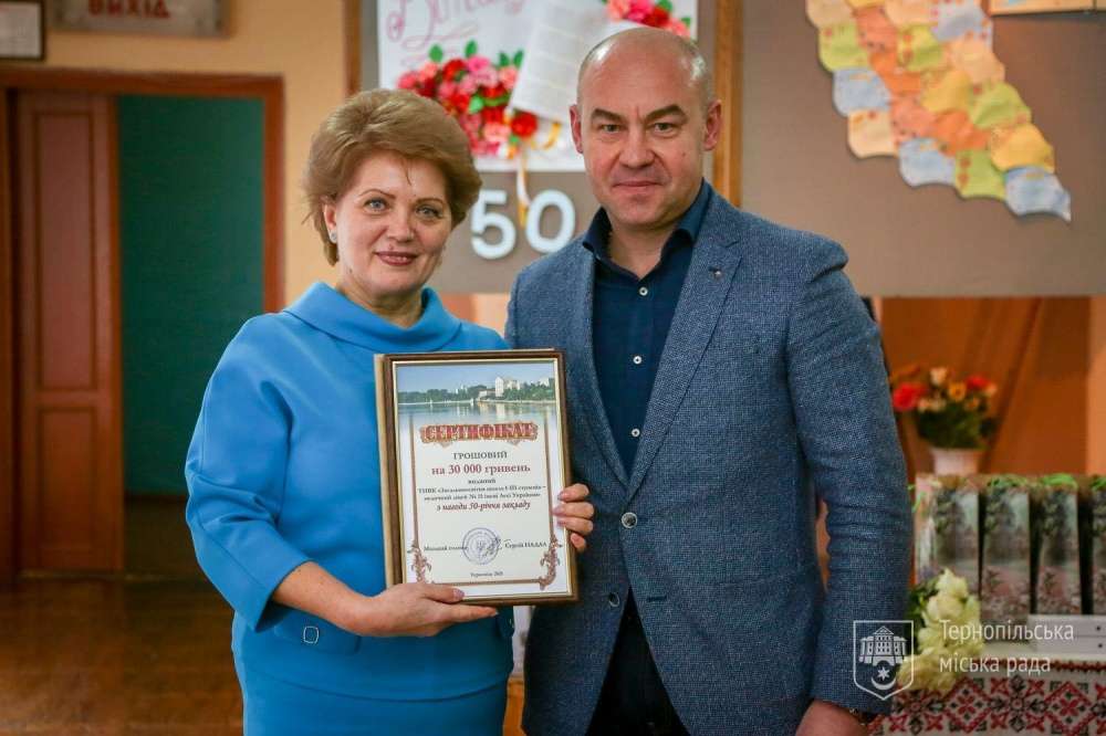 Привітав керівництво та учнівського–педагогічний колектив закладу зі святом і вручив грошовий сертифікат на забезпечення потреб школи міський голова Тернополя Сергій Надал.