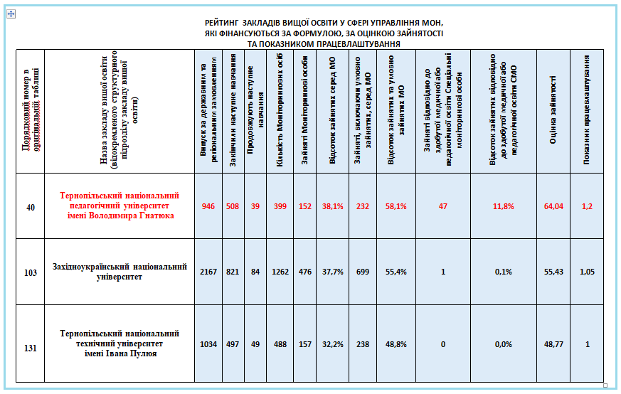 Згідно поданих матеріалів звіту МОН України, ТНПУ має найвищий показник працевлаштування та найвищу оцінку зайнятості.