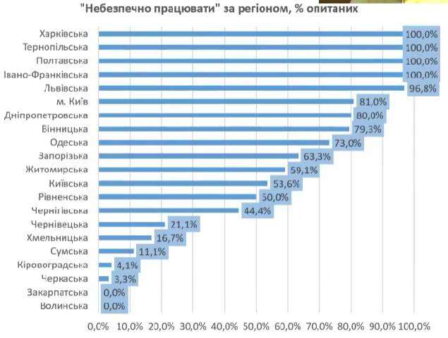 До прикладу, в Києві вважають, що їм небезпечно працювати, 81% респондентів, у Дніпропетровській області – 80%, в Запорізькій, частина якої наразі залишається під окупацією – 63,3%.