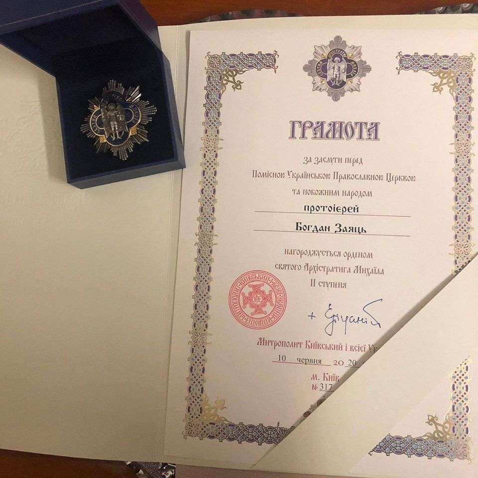 Орденом «Святого архистратига Михаїла» ІІ степеню Православна Церква України нагородила клірика своєї Тернопільської єпархії протоієрея Богдана Заяця.