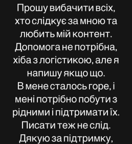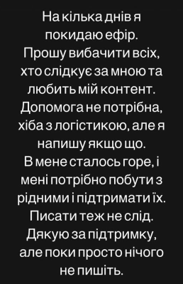 “На кілька днів я покидаю ефір. Прошу вибачити всіх, хто слідкує за мною та любить мій контент. Допомога не потрібна, хіба з логістикою, але я напишу якщо що. У мене сталося горе, і мені потрібно побути з рідними та підтримати їх. Писати теж не слід. Дякую за підтримку, але поки нічого не пишіть”, – поділилася парамедикиня.