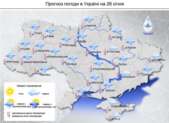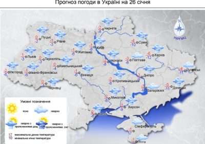 26 січня область перебуватиме під впливом атмосферних фронтів від циклонічної депресії над Скандинавією. Очікується хмарна погода, невеликий сніг та мокрий сніг. Вітер північно-західний, 7-12 метрів на секунду. Температура впродовж доби коливатиметься від 4º морозу до 1º тепла.