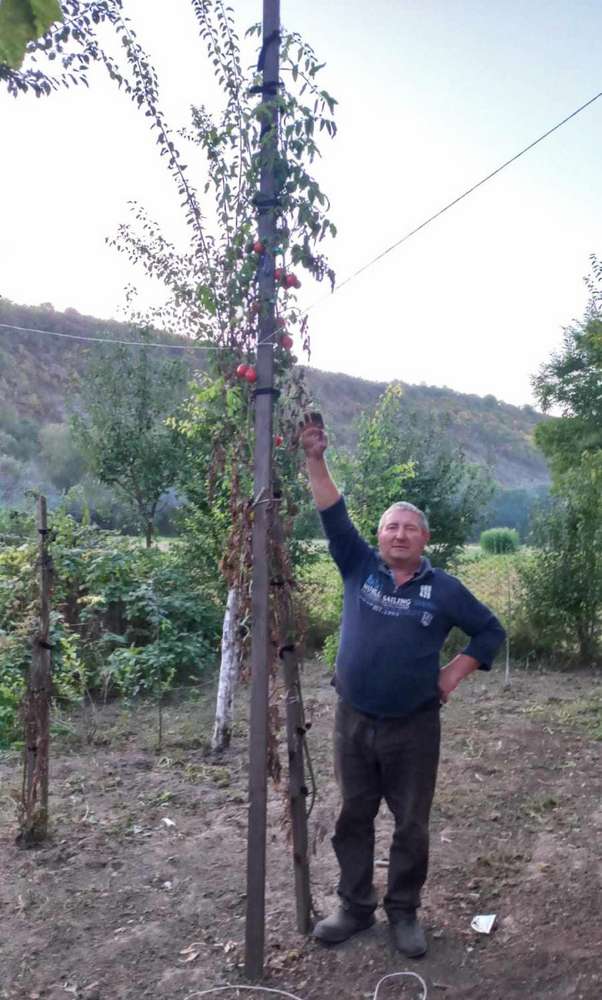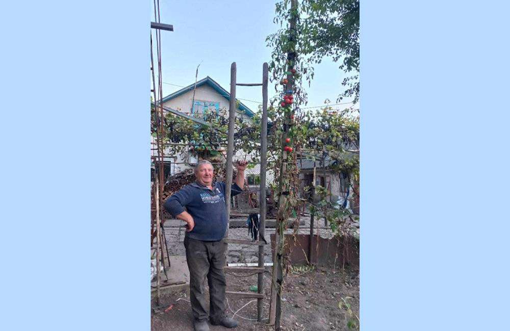 – Думав буде кущ, а виросло височезне дерево, – не приховує свого здивування господар. – За свої майже 62 роки вперше таке чудо бачу. Та й хто до мене приходить, не можуть очей відвести від цього велетня. Питають, де я взяв насіння. Я ж купував звичайну розсаду у чоловіка, який навесні приїжджав у наше село. Тоді у нього багато людей брали помідори, а велетень виріс лише у мене. Продавець казав, що ці помідори високорослі. Але щоб настільки – напевно, й сам не знав. Про сорт я не розпитував. Головне, дивився, щоб стебло було міцне. Купив двадцять рослин. Висадив на грядку, біля кожного кущика закопав кілки заввишки один метр тридцять сантиметрів. Поливав і підгодовував усіх однаково: міндобривом і курячим послідом. Напевно, цей гігант щось крадькома їв (сміється – авт.).
