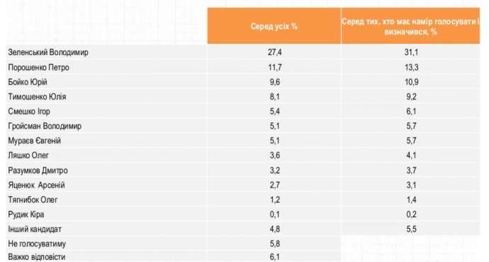 13,3% підтримали б П.Порошенка, 10,9% – Ю.Бойка, 9,2% – Ю.Тимошенко, 6,1% – І.Смешка, 5,7% – В.Гройсмана, 5,7% – Є.Мураєва, 4,1% – О.Ляшка. 3,7% – Д.Разумкова, 3,1% – А.Яценюка. Підтримка інших кандидатів нижче 2%”.