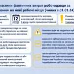 3. Компенсація 50% фактично сплаченого єдиного соціального внеску (чинна з 01.01.2024) за кожну особу, працевлаштовану на нове робоче місце шляхом укладення трудового договору терміном не менше ніж на 2 роки та виплатою протягом 12 місяців з дня укладення трудового договору заробітної плати в розмірі не менше ніж три мінімальні заробітні плати. Заява за формою подається роботодавцем особисто або через персональний електронний кабінет роботодавця з накладенням кваліфікованого електронного підпису не пізніше 45 календарних днів з дати закінчення 12-місячного періоду з дня працевлаштування такої особи.