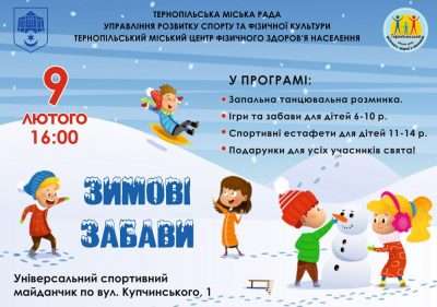 9 лютого у Тернополі на універсальному спортивному майданчику, що на вул. Р. Купчинського, 1, відбудеться другий захід із циклу «Зимових забав» для дітей молодшого та середнього шкільного віку.