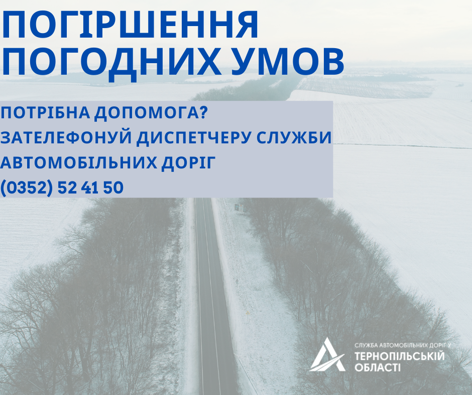 У разі, якщо вам знадобиться інформація чи допомога у дорозі, у Службі автомобільних доріг в Тернопільській області цілодобово працює диспетчер. Зв’язатися з ним можна за номером телефону: (0352) 52 41 50.