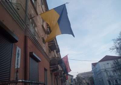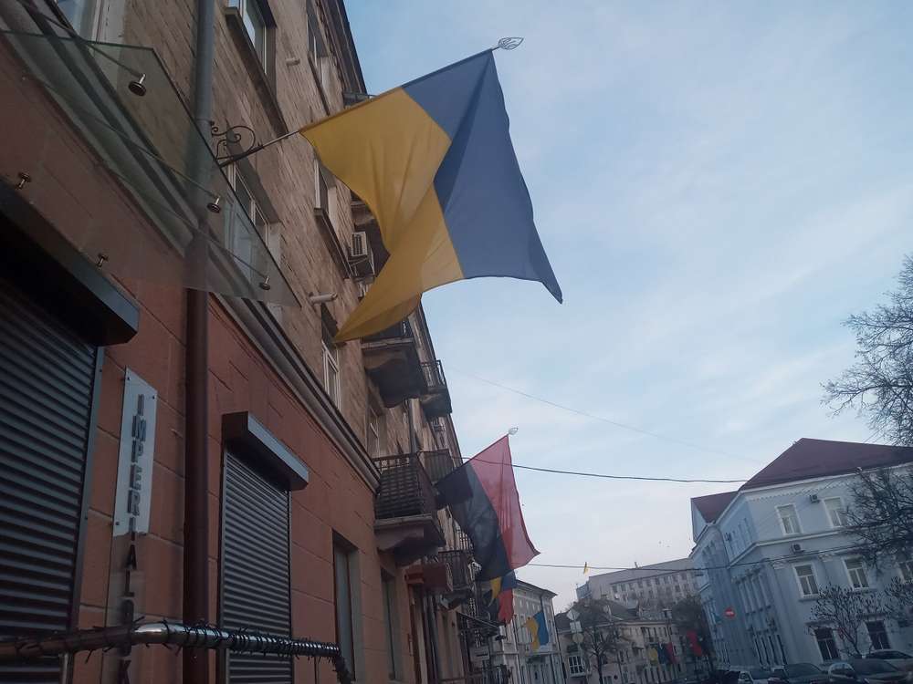 Центральні вулиці Тернополя прикрасили велетенськими синьо-жовтими та червоно-чорними прапорами.