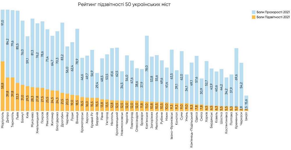 У рейтингу підзвітності, за критеріями якої аналізували 50 українських міст, топ-5 виглядає так: Маріуполь, Дніпро, Тернопіль, Львів, Бахмут.