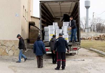 Так, сьогодні чергову партію вантажу відправили до Гостомеля. Це 20 тон питної води та 200 продуктових наборів.