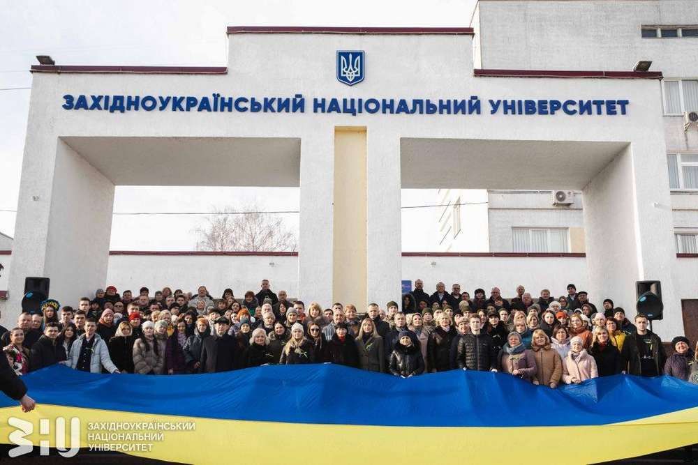 А в Західноукраїнському національному університеті, з нагоди Дня єднання України, студенти, викладачі, слухачі центру підготовки офіцерів запасу ЗУНУ та адміністрація класичного університету Тернополя розгорнули 10-метровий Державний Прапор України на Майдані знань ЗУНУ.