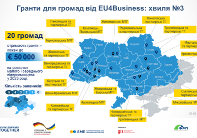 20 лютого відбулося оголошення громад-переможців у конкурсі грантів «EU4Business: конкурентоспроможність та інтернаціоналізація МСП». Згідно з результатами 20 громад, з 45 які подали заявки, здобули перемогу та мають можливість отримати гранти обсягом кожен до 1,8 млн грн (еквівалент 50 000 євро) на системну підтримку малого та середнього підприємництва.
