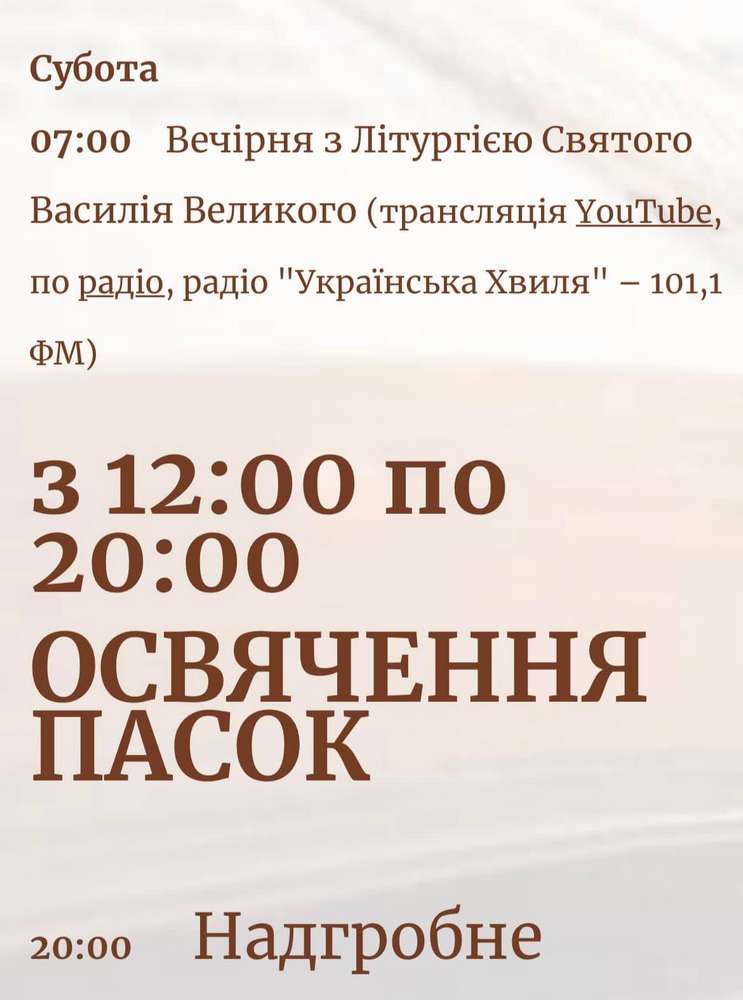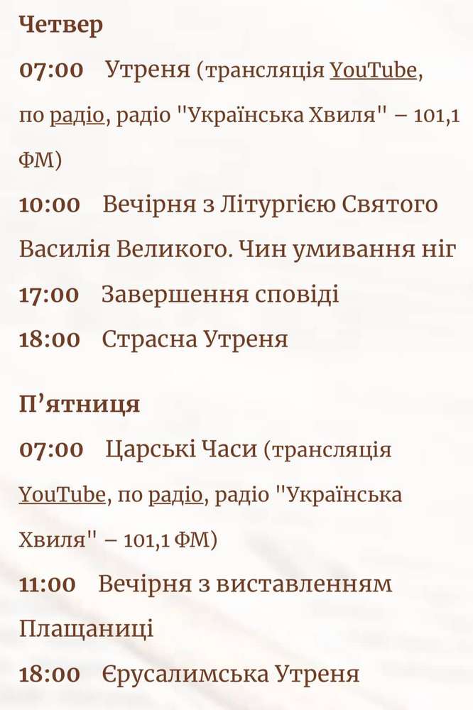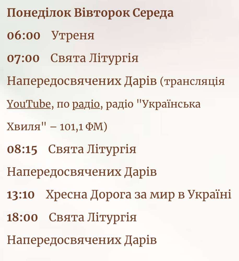 Архикатедральний собор Тернопільсько-Зборівської архиєпархії УГКЦ м.Тернопіль оприлюднив графік богослужінь на Страсний тиждень.