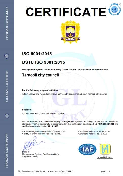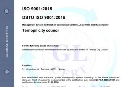 Тернопільська міська рада в черговий раз отримала міжнародний сертифікат якості як одна з найбільш прозорих, відкритих та ефективних серед міст обласного значення.