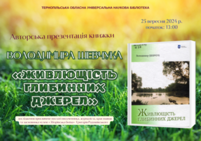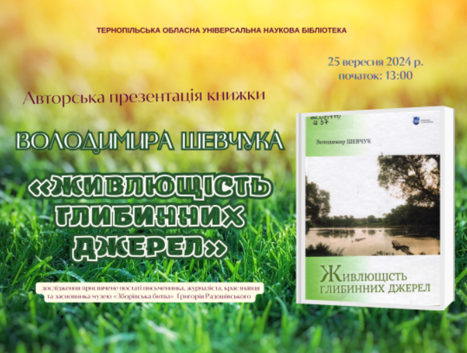 25 вересня о 13:00 в читальному залі Тернопільської обласної універсальної наукової бібліотеки відбудеться авторська презентація книжки Володимира Шевчука «Живлющість глибинних джерел». Це дослідження присвячене постаті Григорія Радошівського — письменника, журналіста, краєзнавця та засновника музею «Зборівська битва».